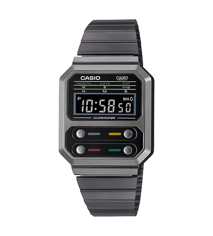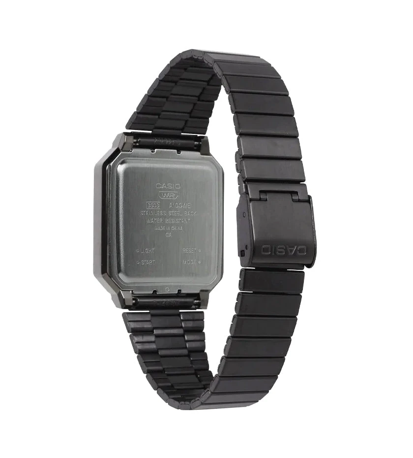 The A100 series is a reproduction of the F-100, CASIO’s first resin case model. The design has been updated for this more modern version while retaining the distinctive layout of the F-100’s four front buttons along with CASIO vintage metal elements.